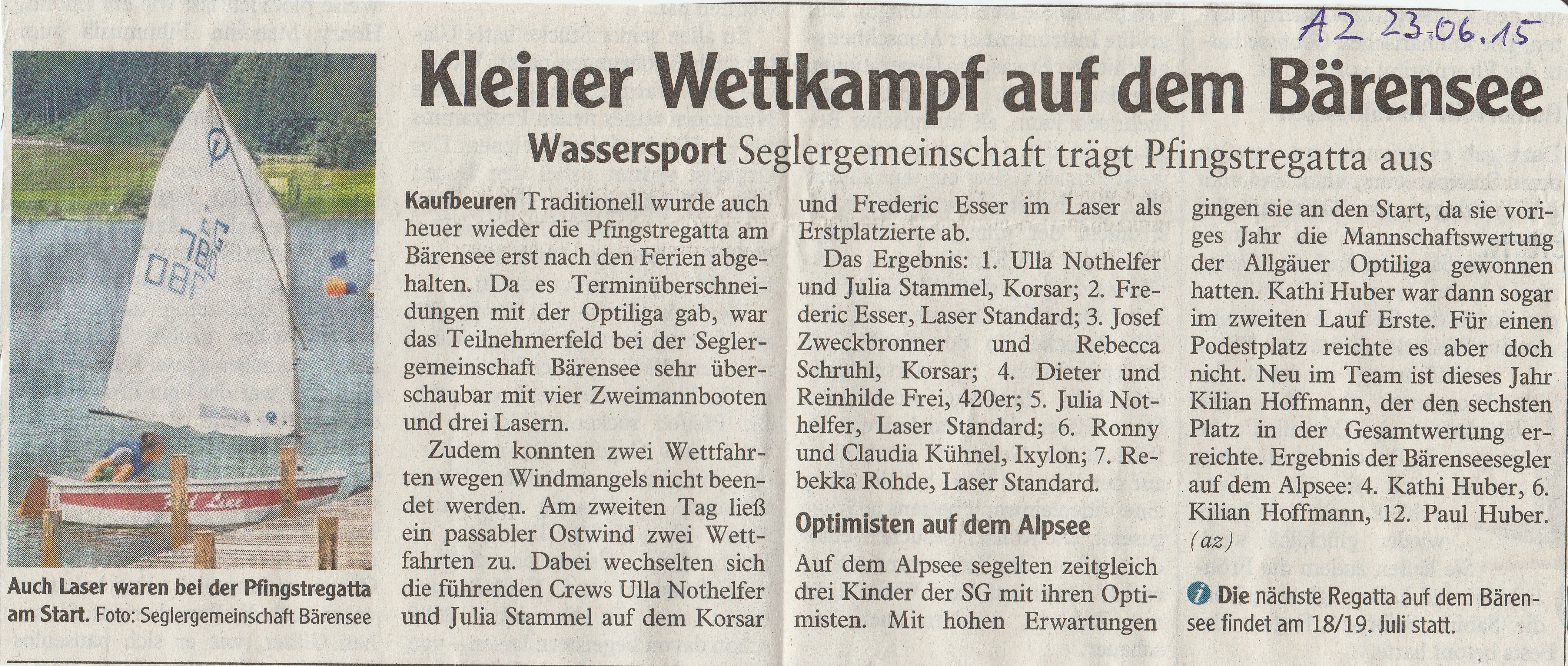 Nach fast zwei Monaten wird auf dem Bärensee wieder gesegelt. Die Pfingstregatta hatte es etwas schwer, denn sie musste sich den Termin mit einer Konkurrenzveranstaltung, der Optiliga auf dem Alpsee, teilen. Somit waren diesmal keine Optimisten am Start und das geringere Verkehrsaufkommen ließ den See gleich viel größer erscheinen.